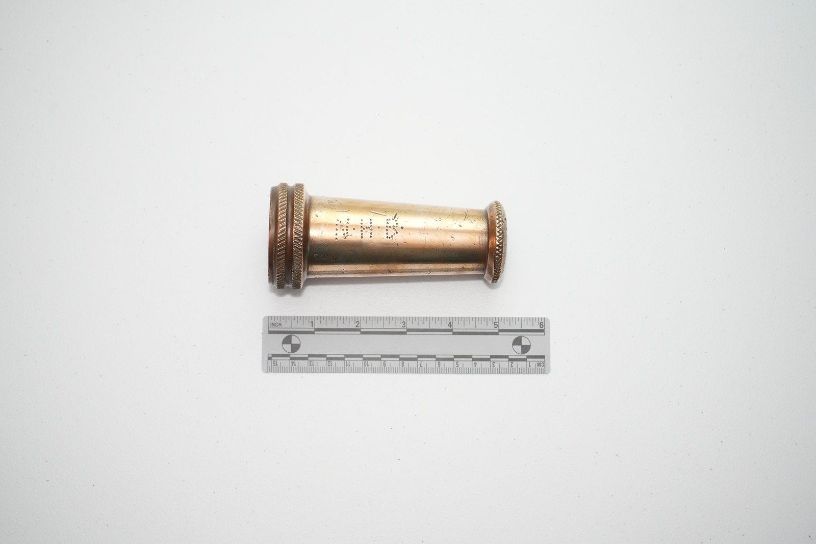 • Stamped with "N.H.B." which stood for "National Harbours Board". This nozzle would have been used aboard the fireboat "Rouille" having worked in Halifax Harbour under the National Harbours Board.