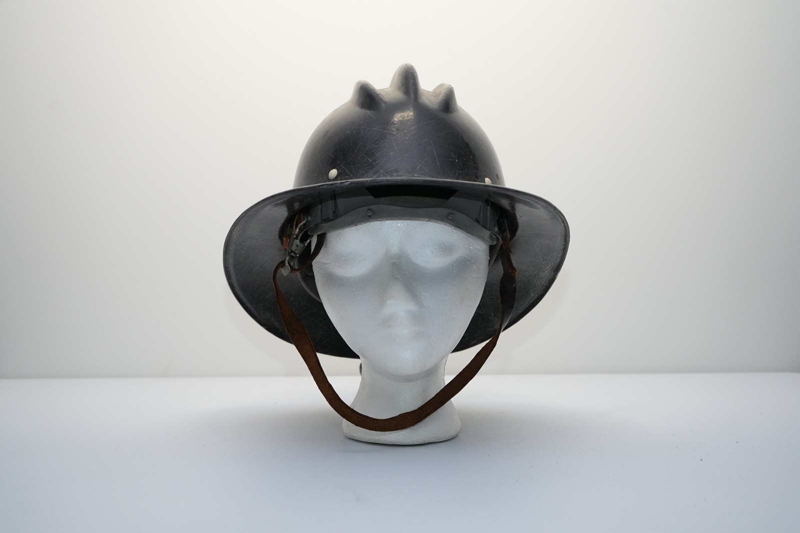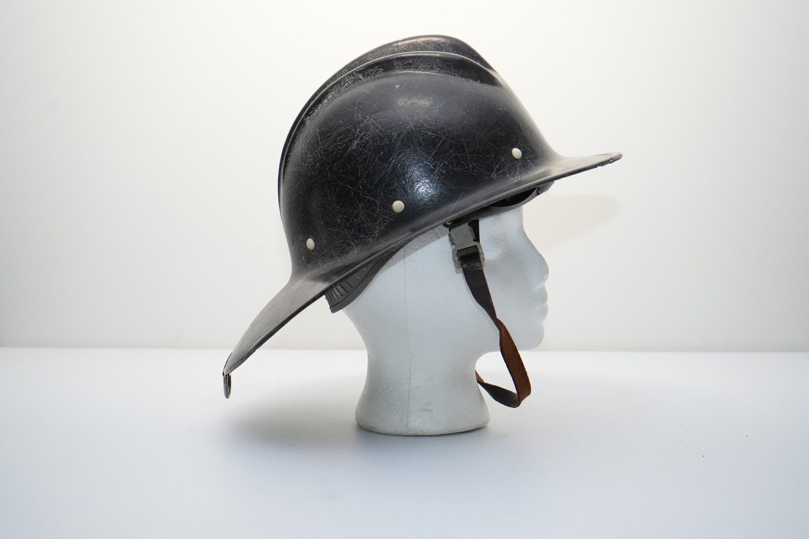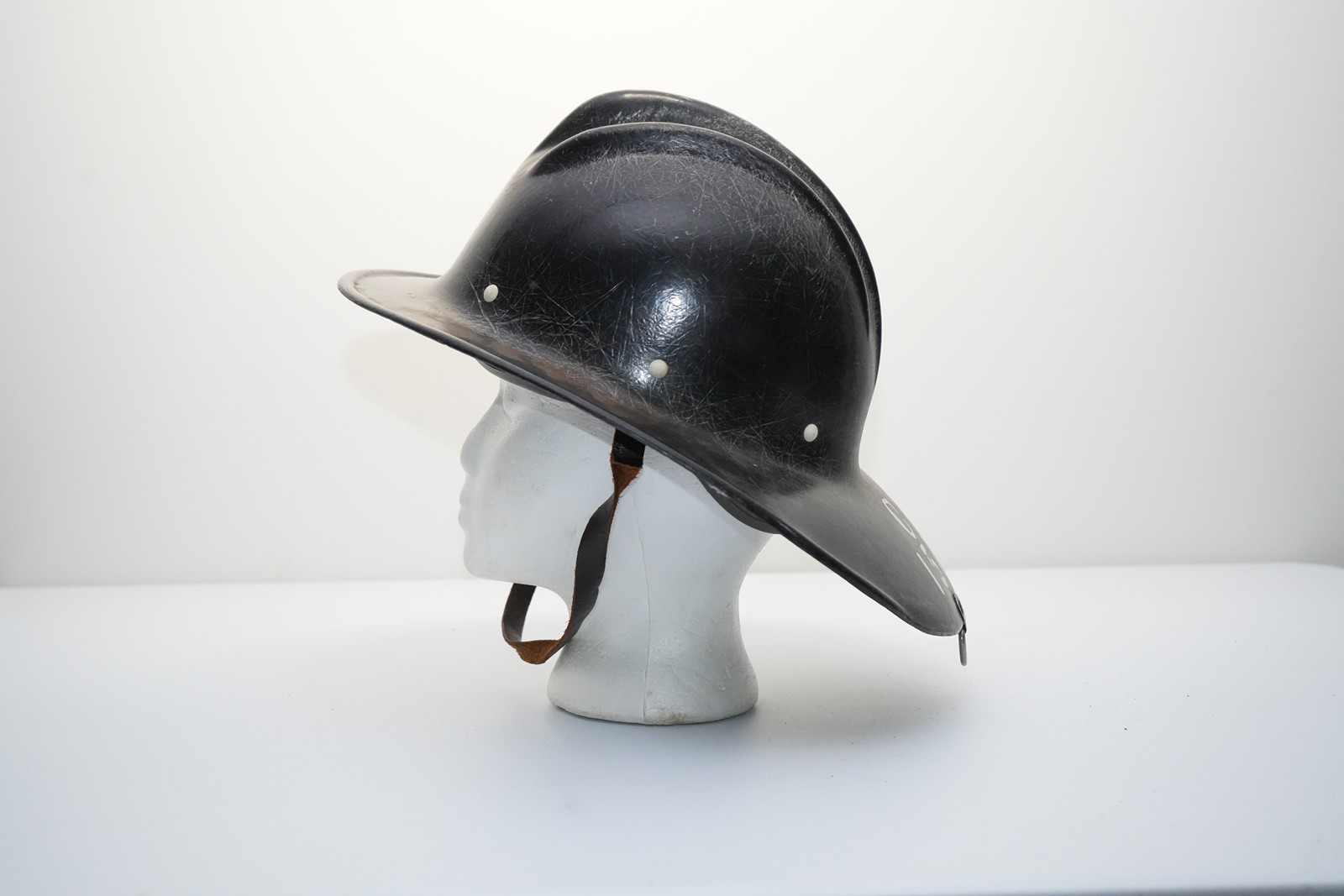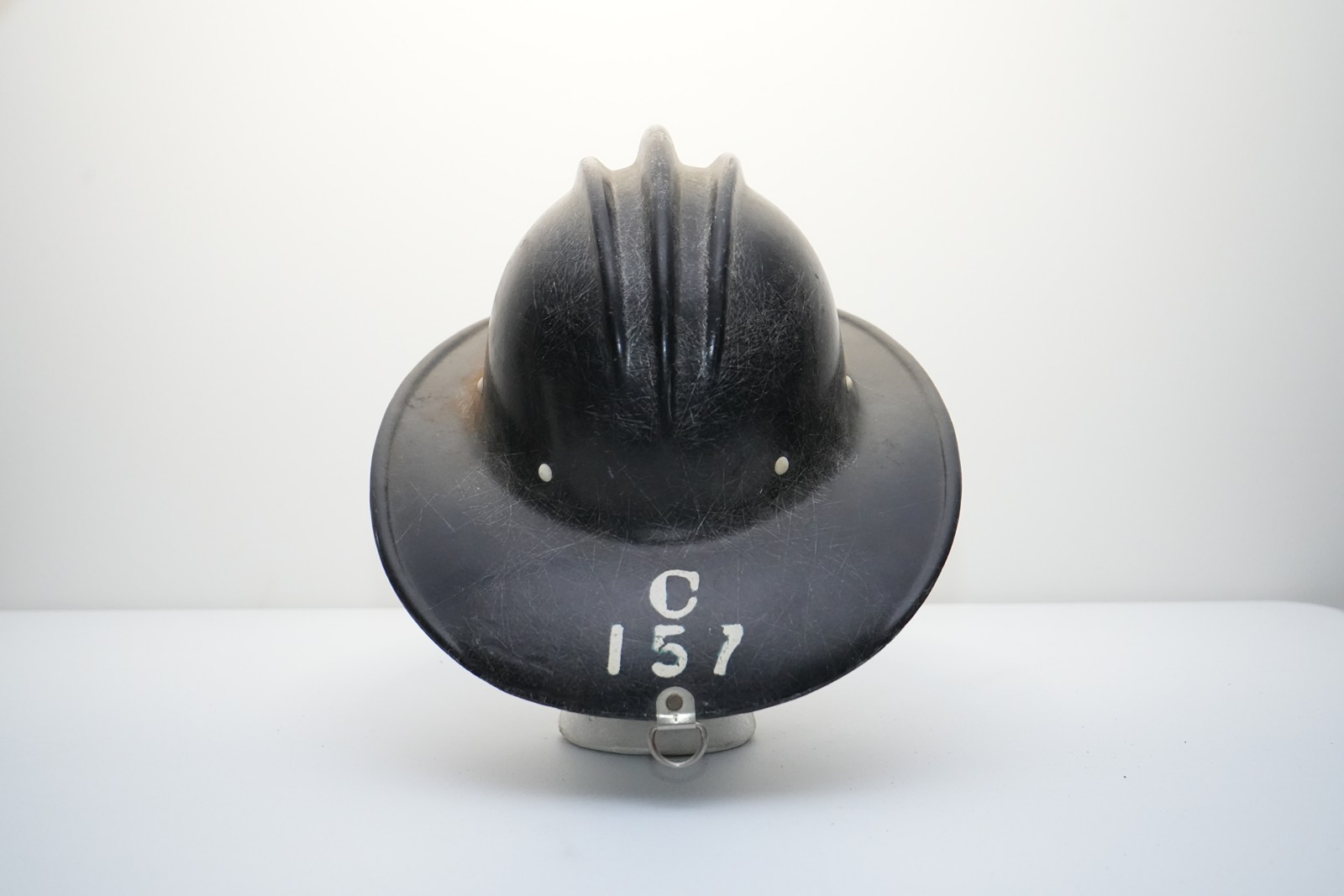 • Pre-1950s E.D. Bullard hard boiled fiberglass firefighters helmet. The hard hat concept comes from Bullard, a hundred-year-old, family-owned manufacturer of personal protective equipment, specializing in industrial head protection, including hard hats, firefighter head protection and supplied-air respiratory protection. The "Hard Boiled" hat, patented in 1919, was so called because of the steam used in the manufacturing process. The original "Hard Boiled" hat’ was manufactured out of steamed canvas, glue, a leather brim, and black paint. Bullard’s distinctive three-rib, heat resistant fiberglass hard hat was developed in the 1940’s.