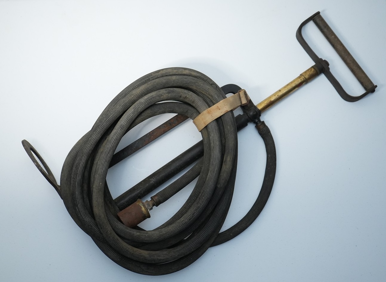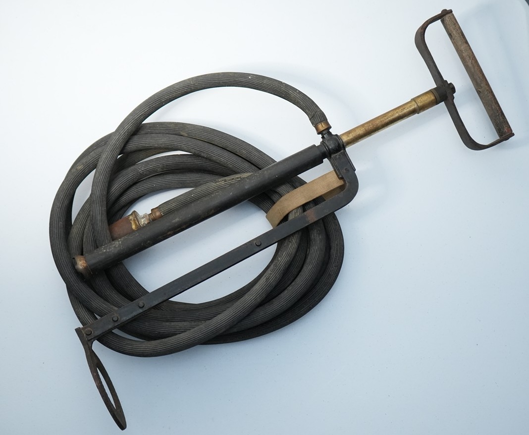 Second World War period A.R.P. stirrup pump, which was used for dealing with fires. It was operated by two or three people, one operated the nozzle while the second person pumped the water from a bucket and the third could replenish the bucket and relieve the other two when necessary. This pattern of pump has a round foot plate.